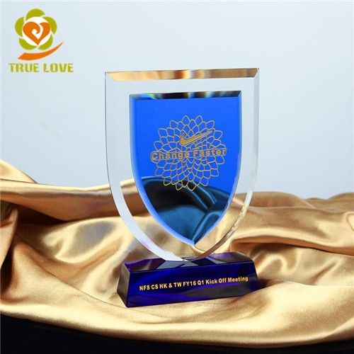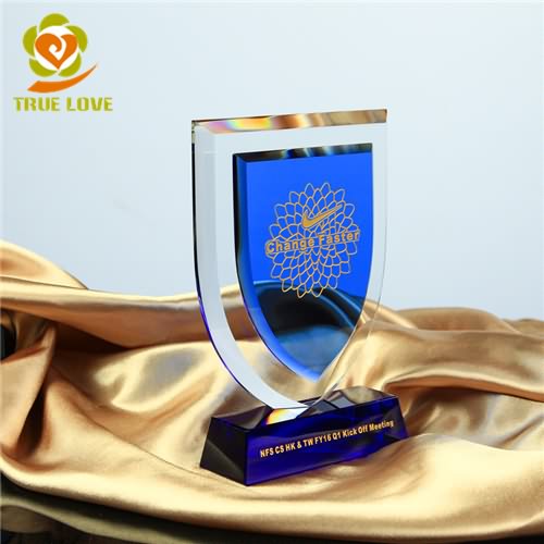 This crystal trophies have shield shape and can be engraving,it also has a blue crystal base.